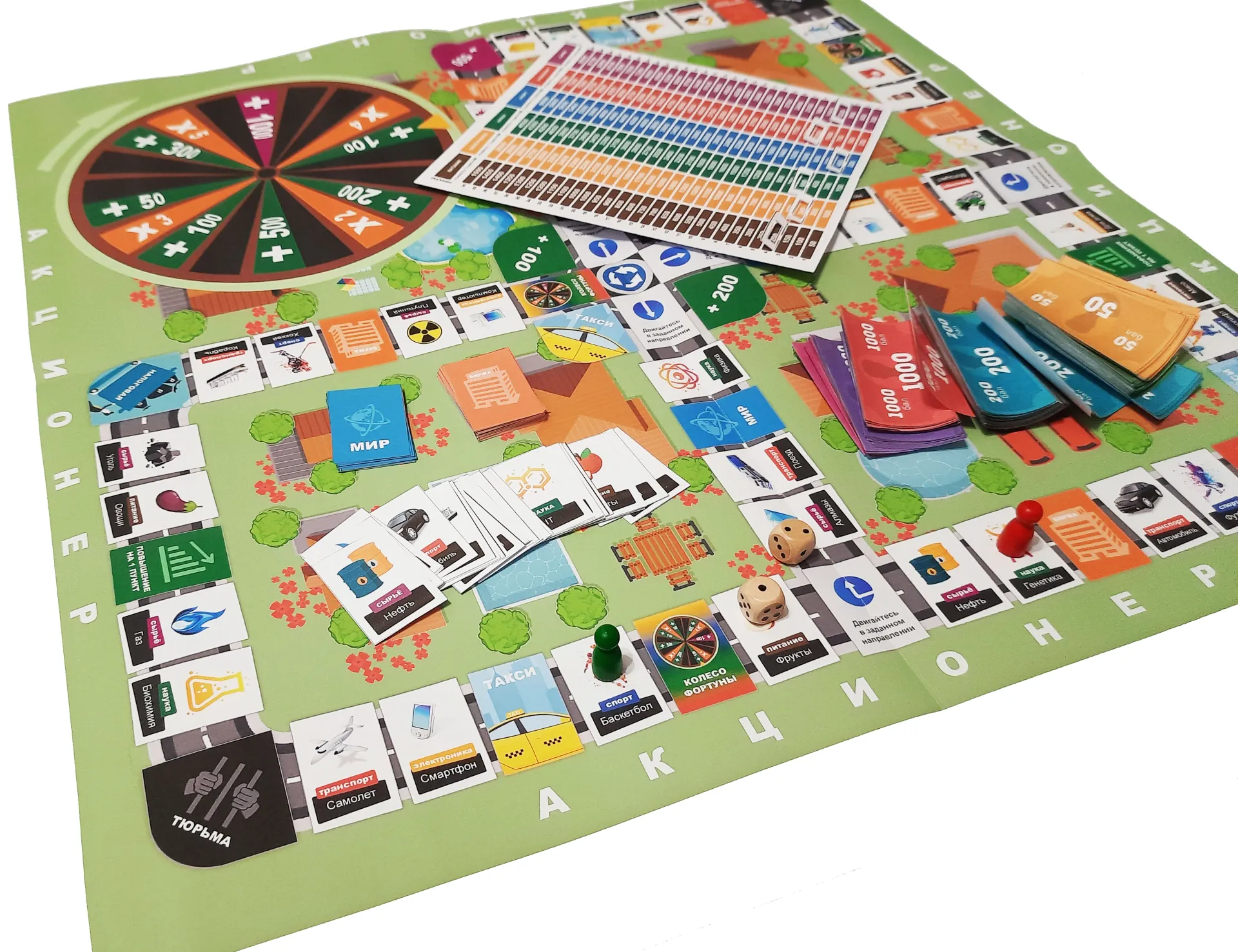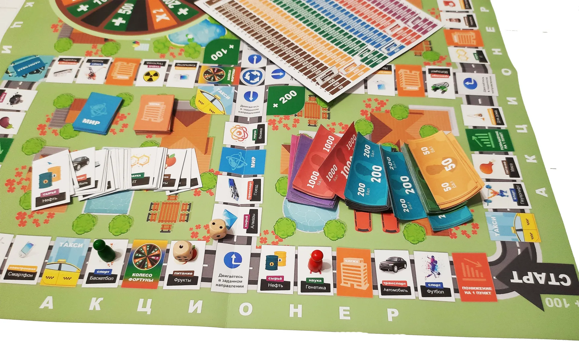 Акционер - увлекательная экономическая настольная игра с динамическими ценами. Примечательность этой игры в том, что стоимость категорий акций может меняться постоянно. Здесь нет фиксированных оплат и поэтому эта игра каждый раз играется совершенно по новому. В игре могут играть от 2 - 8 игроков. В отличии от подобных настольных игр, по времени она играется от 40 минут - 1 часа 30 минут, когда к примеру "менеджер" играется от 3 - 4 часов. Суммы оплат всегда круглые, что позволяет играть не напрягая сильно голову. Очень удобно когда Вы расслабляетесь в компании и не хотите сильно думать.