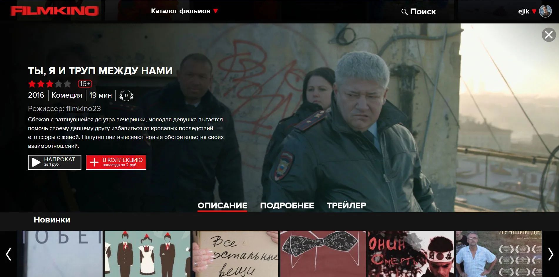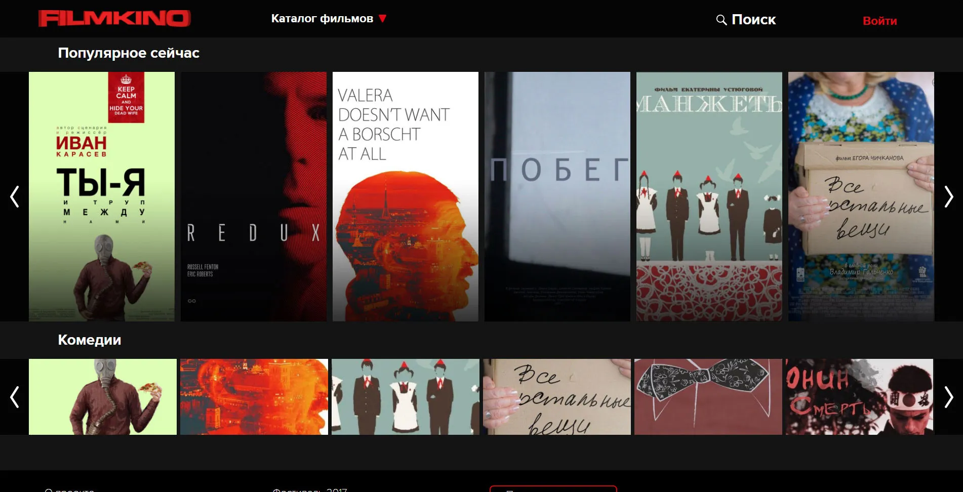 Ещё работая на автосервисе, когда была разработана новая система, заказчик, которому я делал проект Фильмкино, предложил сделать площадку, где можно будет смотреть короткометражные фильмы. Это был очень интересный проект. Я научился делать пиринговое соединение, которое подгружало видео файлы частями. Плюс мы сделали так, что не возможно было скачать файл, так как он имел не формат видеофайла и невозможное получение по прямой ссылке. Так же мобильная версия была очень крутая. Это был очень большой опыт и очень впечатляющий проект. Ниже скрины проекта.